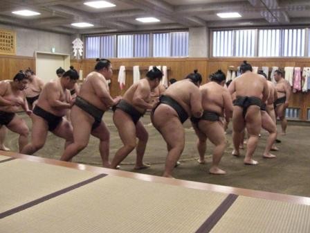Sumo is a contact sport. Sumo wrestlers weighing over 100kg (220 lb) practice with all their strength. You can watch their practice ring side, where the sumo wrestlers wear nothing but a loincloth around the ring. Practice starts from the lower ranked sumo wrestlers. All other wrestlers except the competing two, perform stretching exercises, basic sumo exercises - to strengthen: legs, hips, upper body - and muscle building exercise. A practice match is a serious bout between two sumo wrestlers. As if competing in a real tournament, wrestlers hit head to head, push each other, or throw the opponent out of the ring. The winner is qualified to stay in the ring and competes with a new opponent. Some wrestlers stay in the ring for a long time by beating many opponents. As the practice progresses a higher ranked wrestler comes into the ring and easily defeats the lower ranked winner. Thus showing that the sport of sumo is a world of true ability.